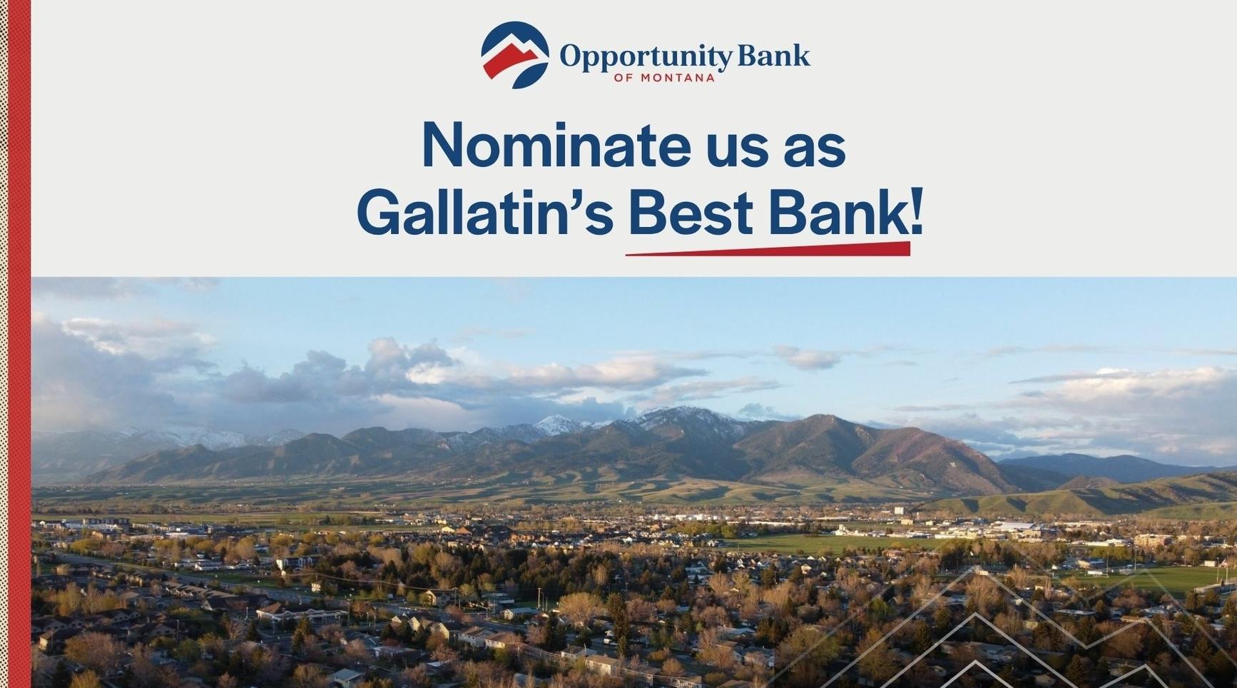 Nominations for the Gallatin’s Greatest Readers’ Choice Awards are now open, giving community members the opportunity to recognize their favorite locate businesses. Opportunity Bank of Montana is eligible for nominations in several categories, including Best Bank, Best Customer Service, and Best Mortgage Lender and we welcome the support of our community members during the nomination phase.
